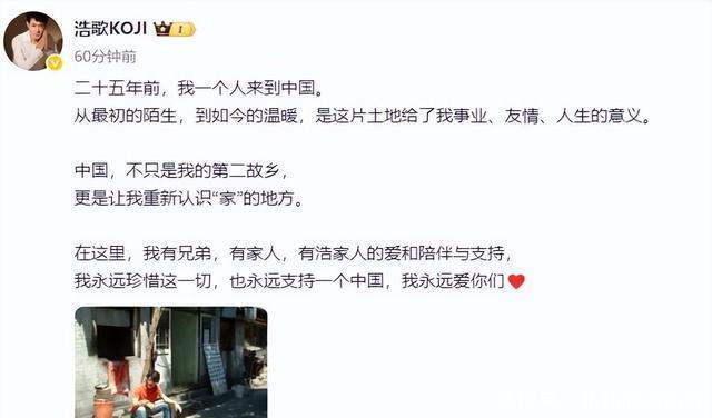 03 在低调沉寂多年后,矢野浩二在今年11月18日的一条微博,让他再次回到了公众视野,这一次,他迎来了口碑的强势反弹。 他在微博中说中国是自己的第二家乡,这里有他的亲人,他永远支持一个中国的原则。 这条微博一出,迅速引发全网关注。