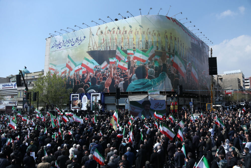 3月18日,伊朗民众在首都德黑兰的革命广场参加葬礼,悼念被美军击沉伊朗军舰上的遇难官兵,以及在以色列发动的袭击中遇害的伊朗安全官员和军事指挥官。新华社记者 沙达提 摄